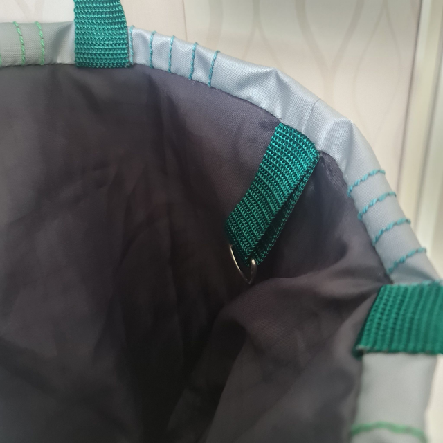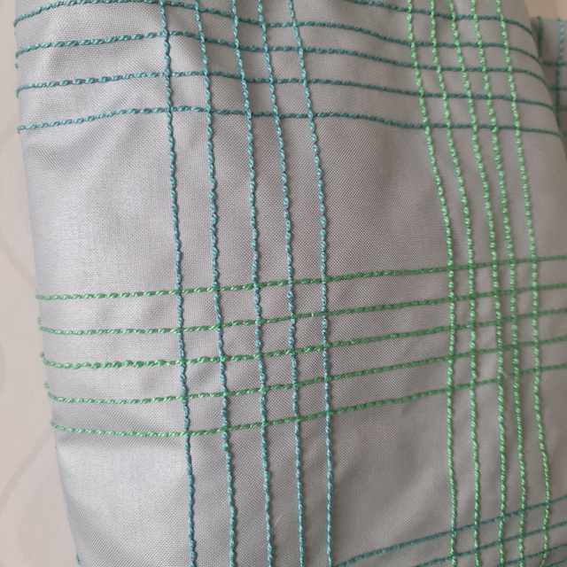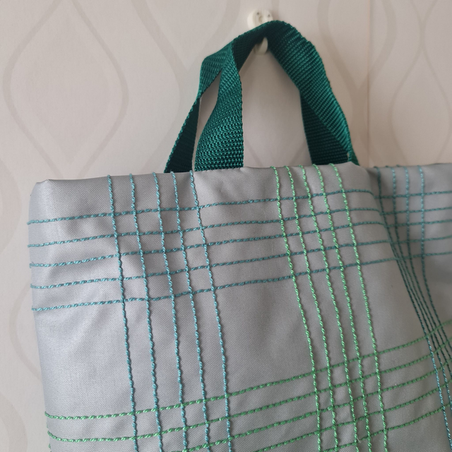 Ljusgrå kasse med gröna band och broderat rutmönster i grönt och blått. Kassen är sydd i tåligt vattenavvisande tyg med handtag i nylon, fodrad med acetatfoder.