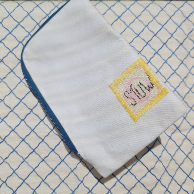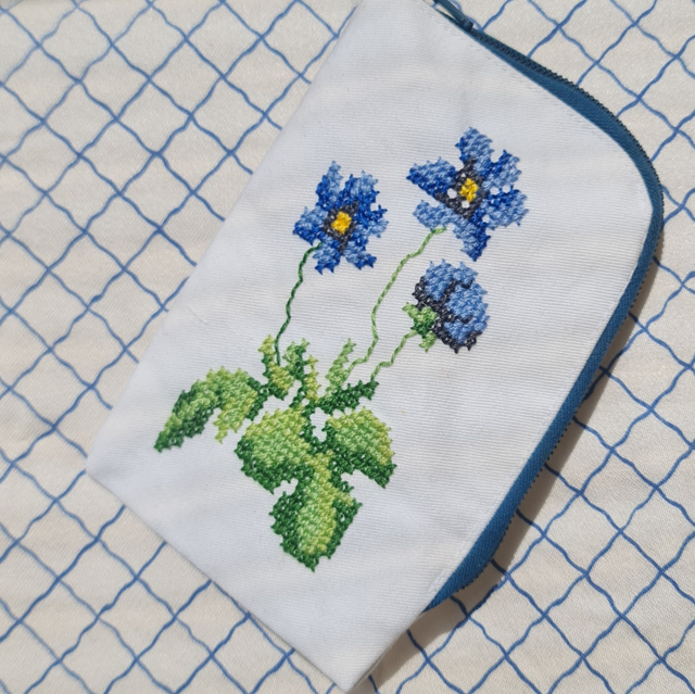Liten necessär i vit bomull med broderade förgätmigej-blommor, perfekt för de där smågrejerna som lätt försvinner! Dragkedjan är lång så det blir lätt att stoppa in och ta ut saker.