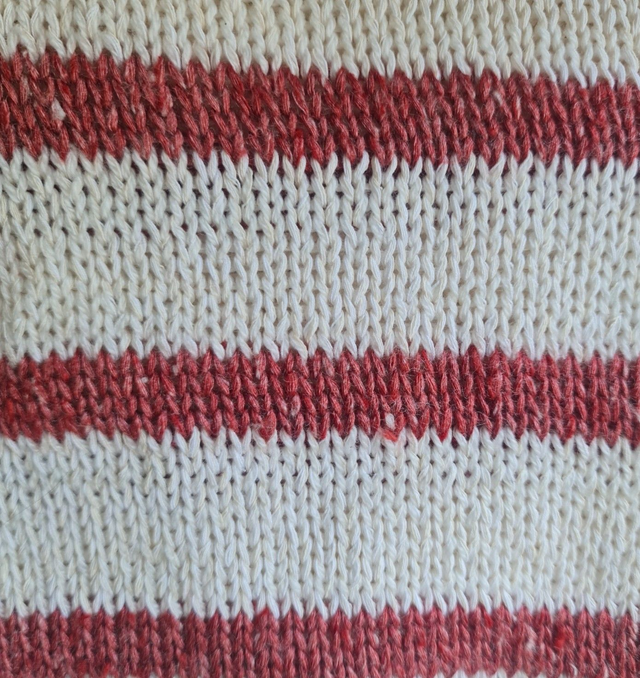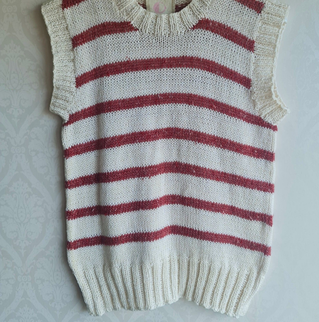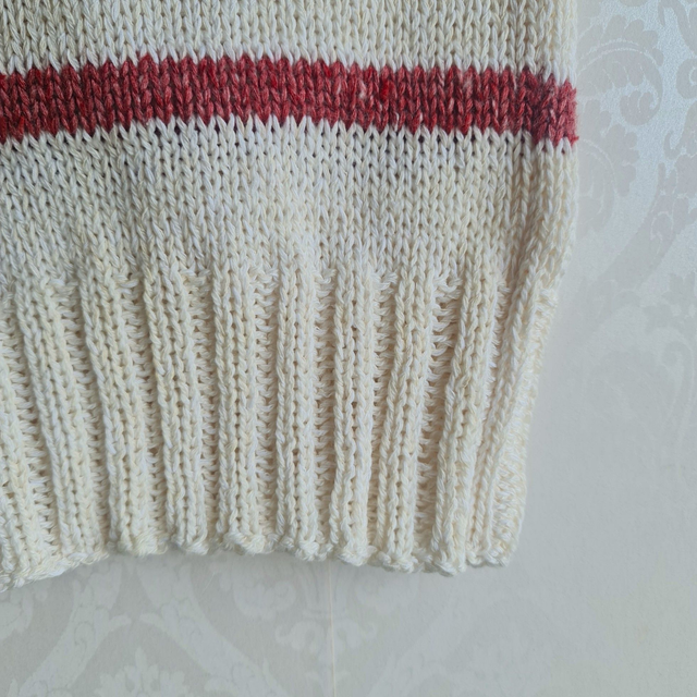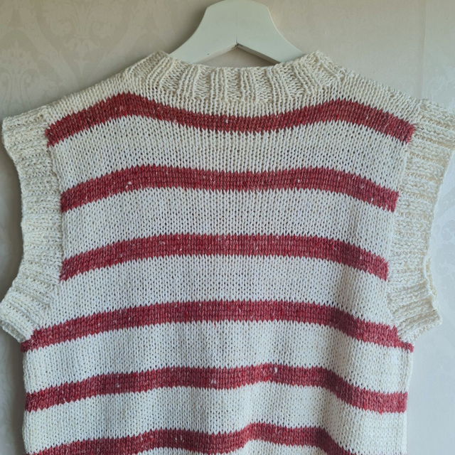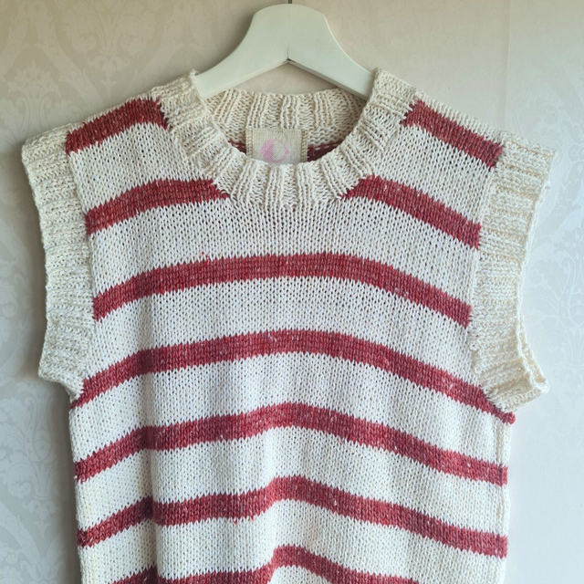 Värmande väst i härliga färger, stickad helt och hållet i räddat garn från en nedlagd vävstuga. Det vita garnet består av två olika bomullsgarner och ett akrylgarn för styrka, det röda garnet har en härlig textur med sin röda glans och inspunna tjockare vita detaljer. Den mjuka vita färgen tillsammans med den djupa röda gör västen till ett perfekt tillskott i en varierad garderob.