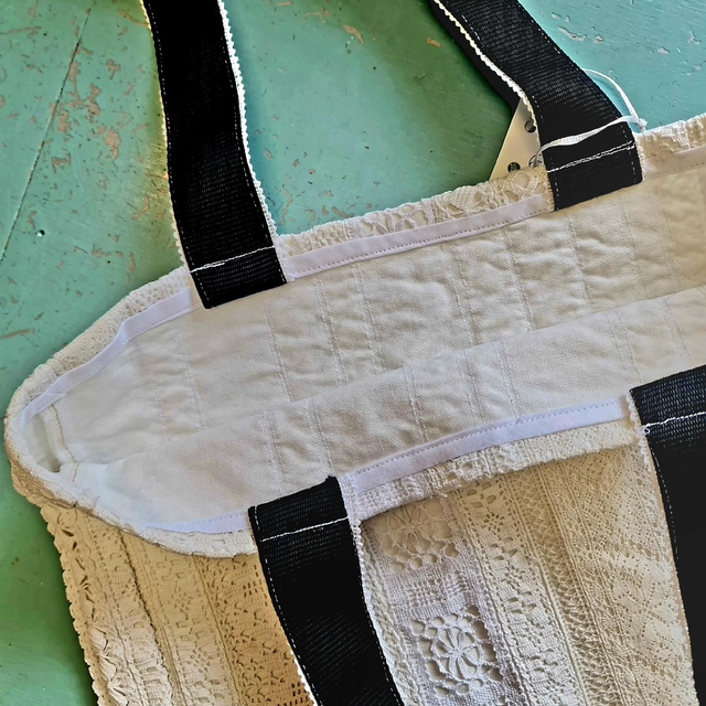 Tygkasse i tjockare bomullscanvas med påsydda spetsar i varierande utföranden. Vissa är virkade, vissa är vävda eller knypplade, många är handgjorda, alla i bomull.