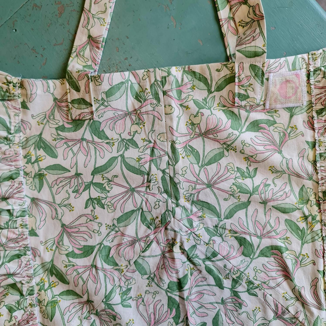 Tygkasse i mönstrat bomullstyg med kaprifoler. Bred volang längs yttersidorna.