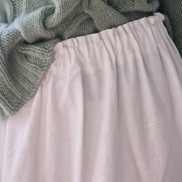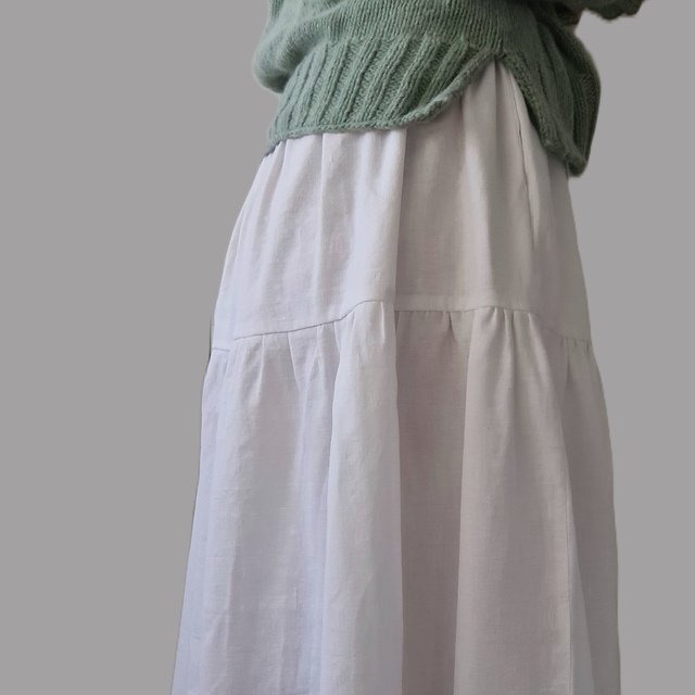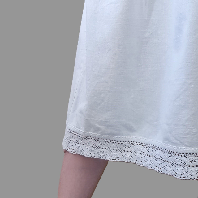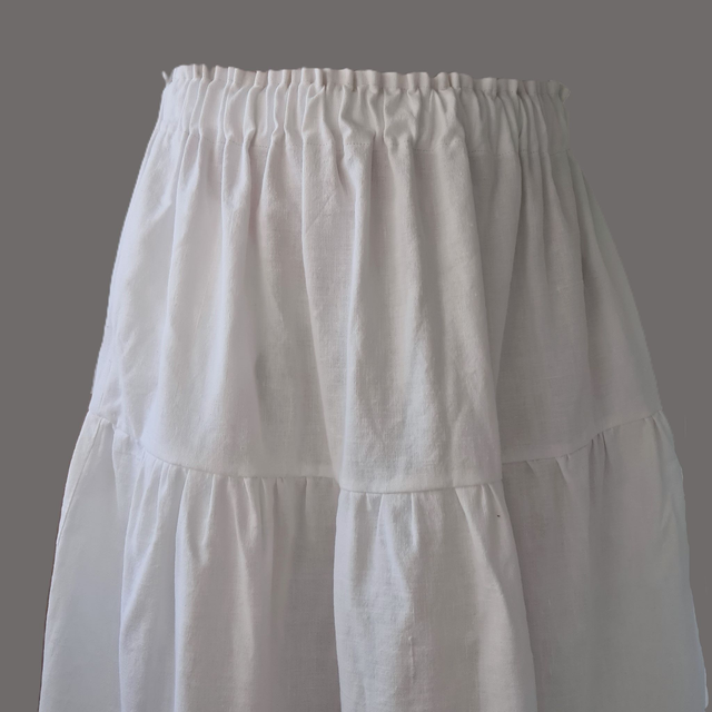 Vit kjol med spets i två paneler. Midjan har en bred, mjuk resår som inte skär in och ficka i sidsömmen.